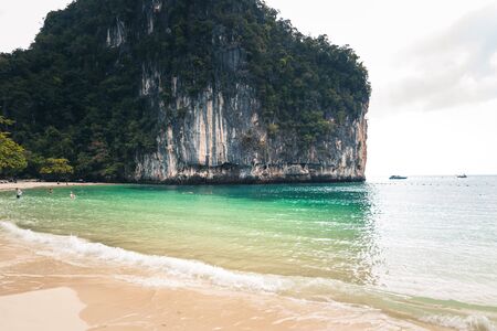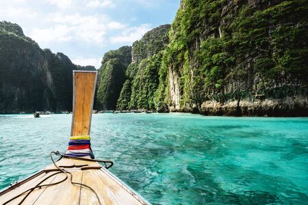 Beautiful sunny bay in Thailand. Tropical exotic holiday landscape. Long tail wooden boat ride over sea water.