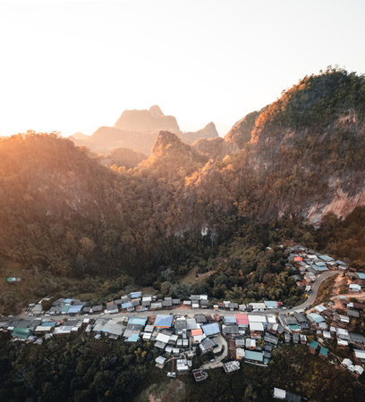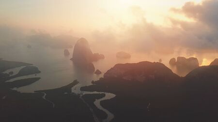 Amazing Landscape light nature scenery view, Beautiful light sunrise or sunset over Tropical sea and mountains peak in thailand Aerial view Drone camera shot High angle view