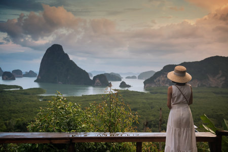 Asian woman view Phang Nga Bay from Samed Nang Chee or Nangshe viewpoint at dusk with twilight sky, Thailand. Famous travel destination or holiday vacation in tropical country, Siam.
