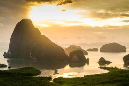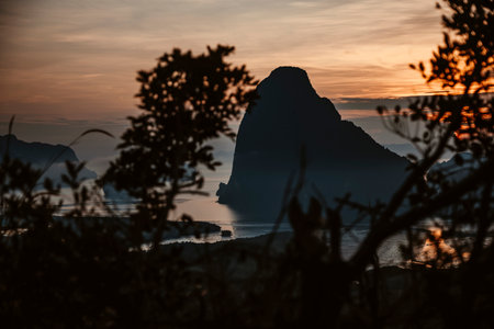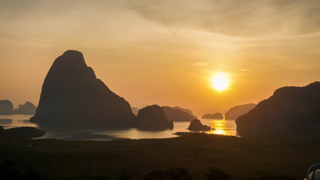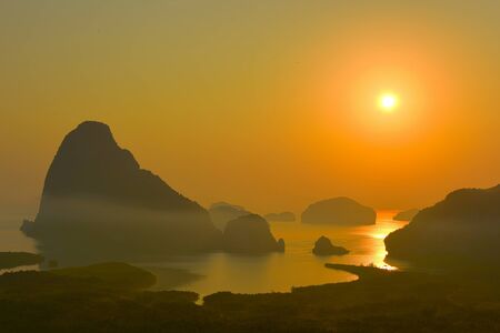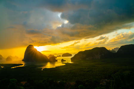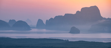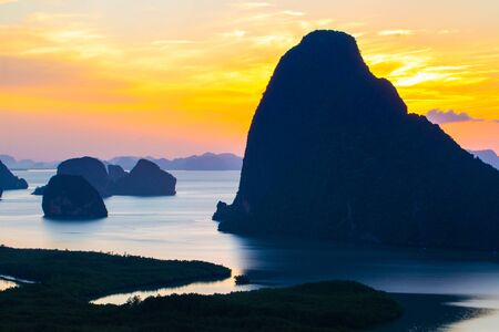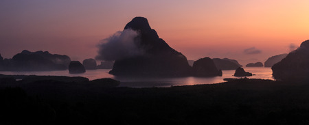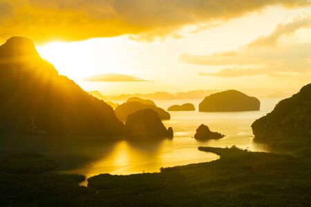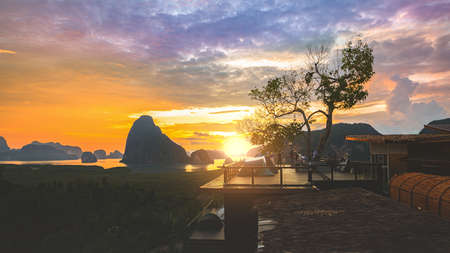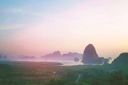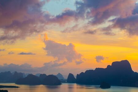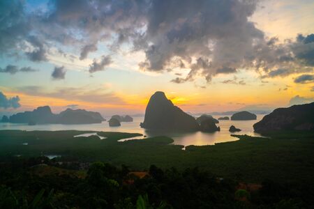 Mountain view sunrise of Phang Nga Bay at Samet Nang She Viewpoint, Phang Nga, Thailand. The famous landmark and famous travel destination.