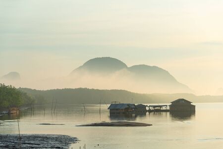 Traditional fisherman house built on water in the morning, with fog in southern rural of Thailand