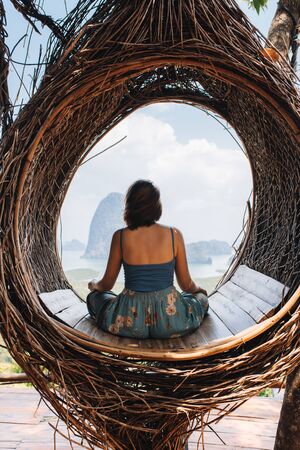 A girl sits in a nest in a lotus position on top of a mountain overlooking a bay