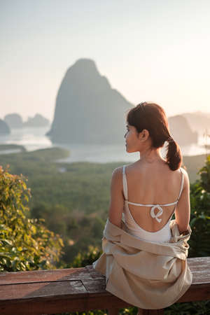 Happy traveler woman enjoy Phang Nga bay view point, alone Tourist sitting and relaxing at Samet Nang She, near Phuket in Southern Thailand. Southeast Asia travel, trip and summer vacation concept