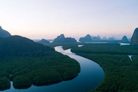 Aerial view sea and river in tropical mangrove green tree forest with fog morning sunrise