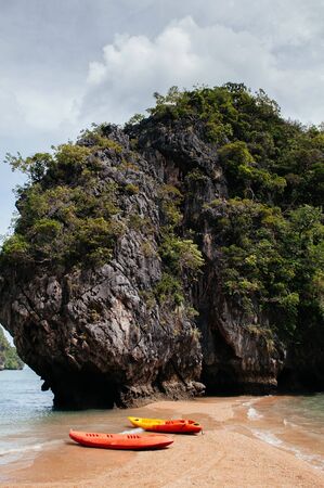 Colourful Kayak boats at Rock island of Koh Talabeng near Koh Lanta, Krabi, Thailand. Summer outdoor water sport