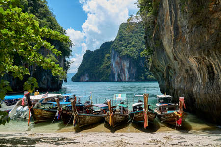 Wooden longtail boats at the beach of Laolading Island in Krabi, Thailand