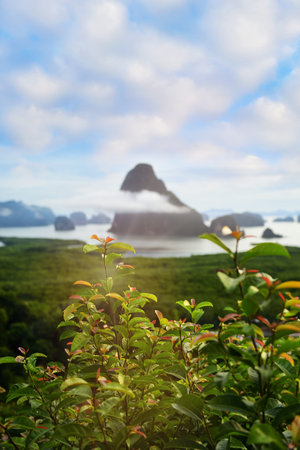 Close-up treetop with sunbeam on Phang-nga bay background at Samet Nangshe in Phang-nga province, Thailand, Natural outdoor background concept and work life balance with recovery idea