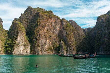 Beautiful tropical island of Koh Phi Phi, Thailand with blue water and green rocky formations