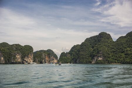 Phuket, Thailand - circa September 2015: Boats sails near limestone cliffs of Andaman Sea, Phang Nga Bay, Thailand