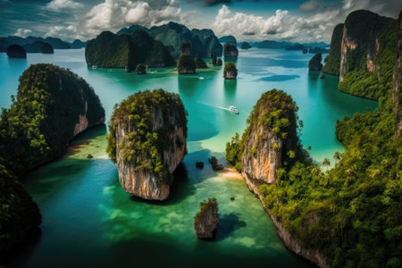Sea views and rocky islands with a long-tail boat.form above in krabi
