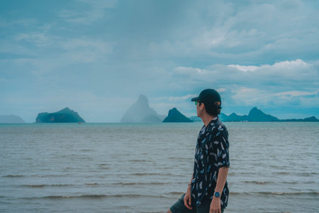 young man Asian people enjoys a moment of relaxation in a sea and nature. His happiness and self-love shine through as he embraces the peaceful outdoors.