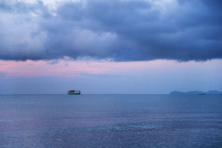 A cargo ship carrying material is docked at the beach. Island areas in the Gulf of Thailand