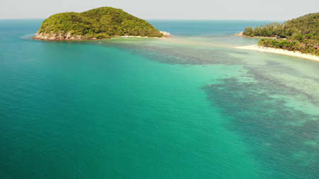 Aerial drone view small Koh Ma island, Ko Phangan Thailand. Exotic coast panoramic landscape, Mae Haad beach, summer day. Sandy path between corals. Vivid seascape, mountain coconut palms from above
