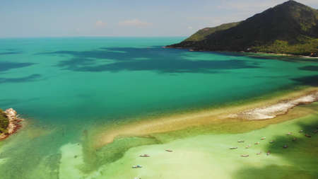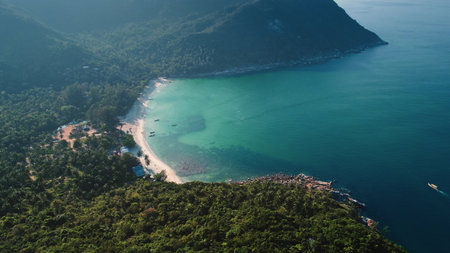 Aerial view of Bottle Beach with turquoise water, white sand, green tropical vegetation, and traditional thai boats gently rocking on the calm sea in Koh Phangan, Thailand. Travel, tourism, holiday