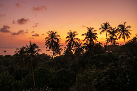 Beautiful natural landscape of coconut trees on the beach in front of Ko Wua Ta Lap island, under the colorful sky at sunset, Mu Ko Ang Thong National Marine Park in Gulf of Thailand, Surat Thani province