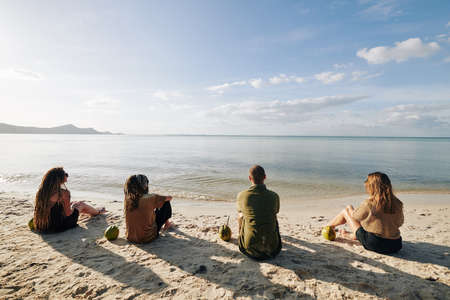 Group of friends sitting on beach with coconut cocktails and looking on calm water