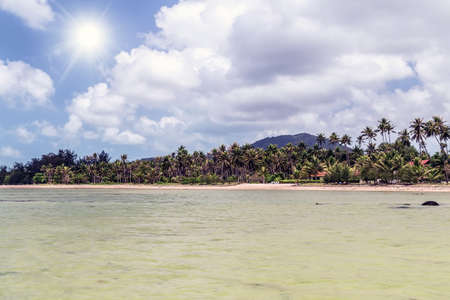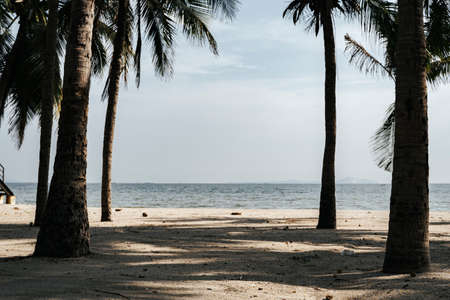 Breathtaking scenery the sand shore of the calm ocean and the beach surrounded by the tropical plants in the exotic island. Kingdom of Thailand. Perfect background for the illustrations and collages.