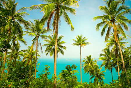 View of nice tropical background with coconut palm trees over sea and sky in Thailand