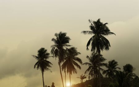 Coconut palm forest with the last rays of the sunset. Evening landscape of beautiful tropical forests in Asia