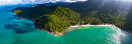 Aerial drone view island Koh Phangan Thailand. Exotic coast panoramic landscape, Chaloklum Malibu fisherman beach, summer day. Sandy path, corals. Vivid seascape, mountain coconut palms from above