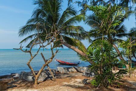 Palm tree and fishing boat at Sairee beach on Koh Tao in Thailand, Asia