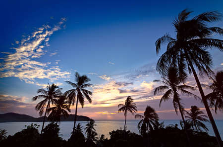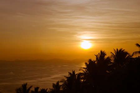 Beautiful Silhouette coconut palm tree on the tropical beach. Bright colorful sunset sky over the ocean water, Thailand.