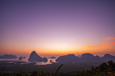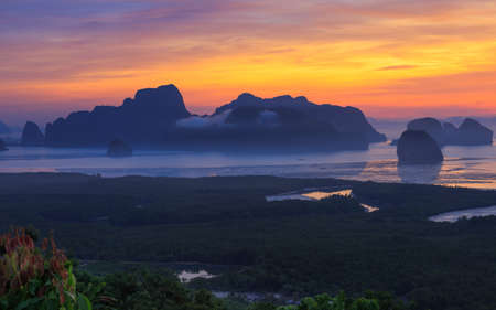 Mountain view sunrise of Phang Nga Bay at Samet Nang She Viewpoint, Phang Nga, Thailand. The famous landmark and famous travel destination.