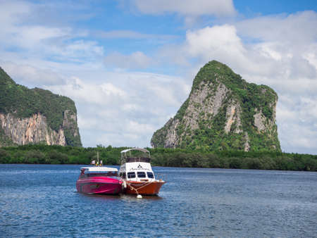 Phuket, Thailand - circa September 2015: Boats sails near limestone cliffs of Andaman Sea, Phang Nga Bay, Thailand