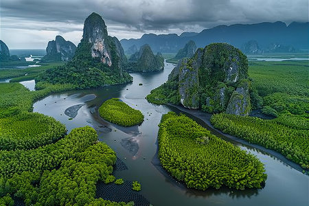 Aerial view of the island group with mangrove forests and rock formations in phang nga, thailand. a large river meanders through lush green vegetation leading to an expanse of water under grey sky. in front is an area covered by black holes for shrimp farming, and behind it lies more rocky islands.