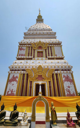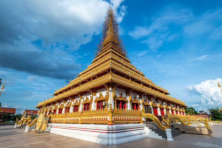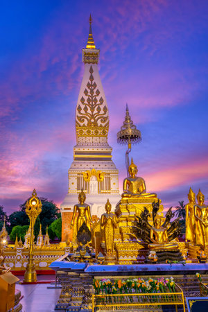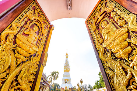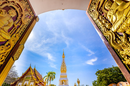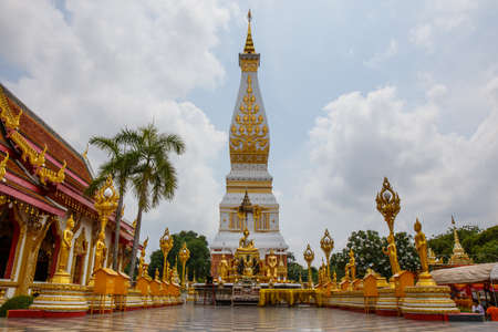 Golden pagodas and ancient statues adorn the stunning Thai Buddhist architecture of this temple in Nakhon Phanom, a perfect landmark for travel and sightseeing in Asia.