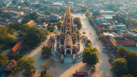 An aerial view of the Roi Et City Pillar Shrine, with its distinctive architecture standing out in the heart of the city.