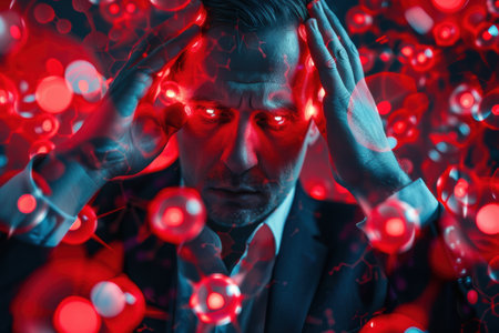 dark, foggy setting, spectral hands reach in from the edges, almost touching him, reflecting anxiety or haunting memories. Generative AI