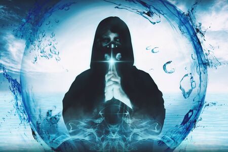 View of wizard with mask spelling witchcraft. Water element. 3D illustration.