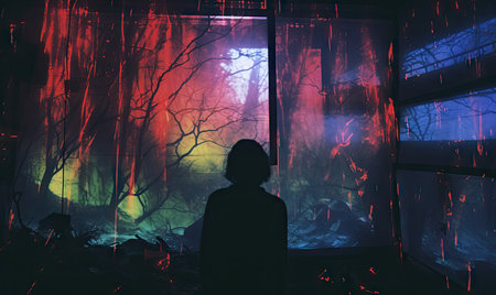 Figure stands in dim room with plasma screens projecting vibrant visuals, casting shadows and a deep crimson ambiance. Created with generative AI tools
