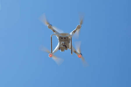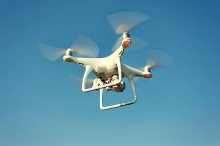 White drone quad copter with flying in the blue sky