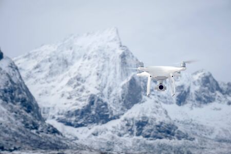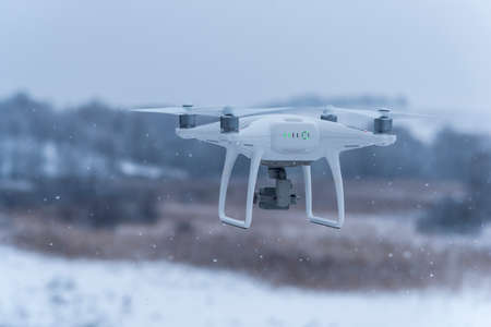 Hovering drone taking pictures of wild nature. Cold winter weather. Cloudy day with falling snow.