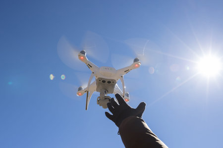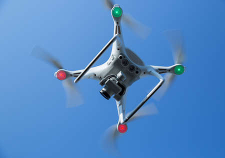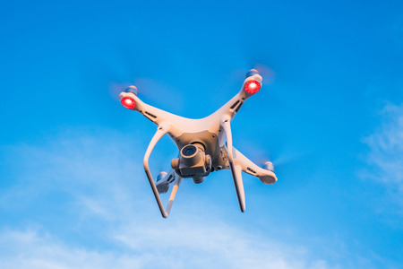 Flying drone with blue sky background.
