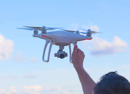 The drone and photographer man hands , The drone with the professional camera takes pictures.