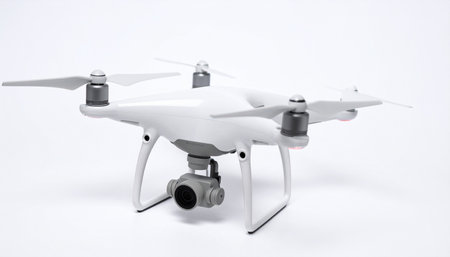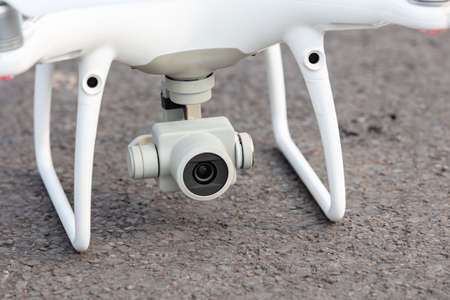 White drone quadcopter with digital camera outdoors