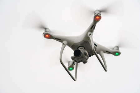 KAMCHATKA PENINSULA, RUSSIAN FEDERATION - AUGUST 28, 2019: DJI Phantom 4 Pro quadcopter drone with digital camera 4K flight in overcast white sky, takes pictures world around from bird's eye view.