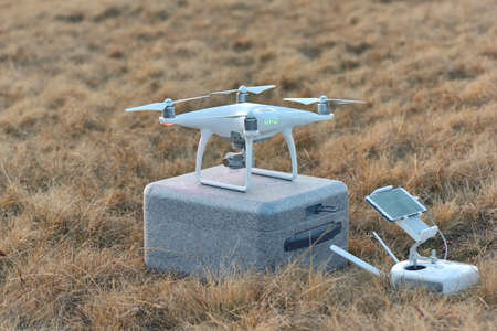 Krasnodar, Russia - May 30, 2017: White drone on the soil with grass
