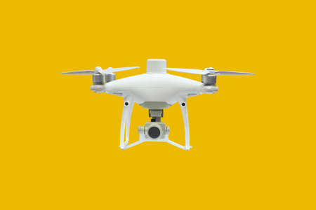 Portable mini aircraft, a four-propeller mini glider with a small camera to record high-angle stills and videos and using a wireless remote control, isolated on yellow background