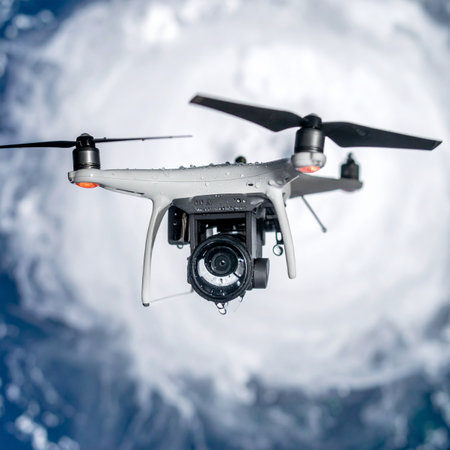 A state-of-the-art drone hovers on a critical mission, flying directly into the turbulent eye of a massive hurricane. It gathers essential meteorological data, providing a unique aerial perspective for weather forecasting, scientific research, and disaster preparedness.