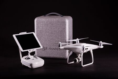 PECS, BARANYA, HUNGARY - MARCH 1, 2017: Brand new DJI Phantom 4 pro quadcopter drone with controller and ipad air 2 black studio background
