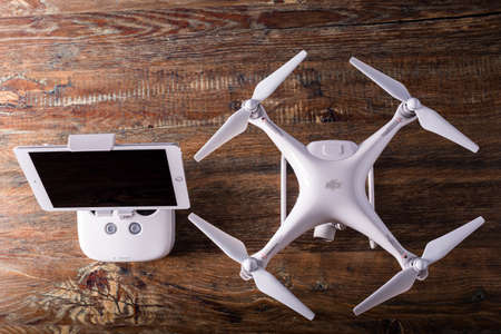 PECS, BARANYA, HUNGARY - MARCH 1, 2017: Brand new DJI Phantom 4 pro quadcopter drone with controller and ipad air 2 wooden studio background