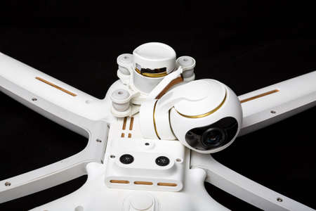 Broken white drone after a fall. Isolated on a black background. Damaged stabilizer camera gimbal. Plugged cable loop Close up. Device to repair
