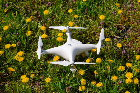 Krasnodar, Russia - April 14, 2017: Quadrocopter DJI Phantom 4 is on a clearing with dandelion flowers.