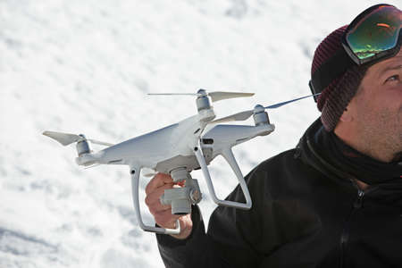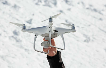 a mans hand holding a professional quadrocopter against the background of a snowy field