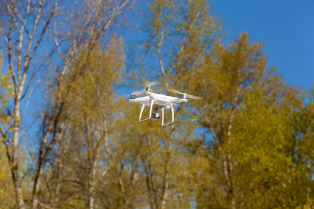 Ukraine, Kyiv 25 april 2017 quadcopter flies takes off video and photo from air,white quadcopter steams in air
