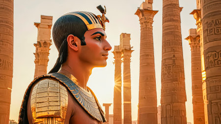 Majestic close up of a golden pharaoh statue against ancient egyptian architecture with radiant glow